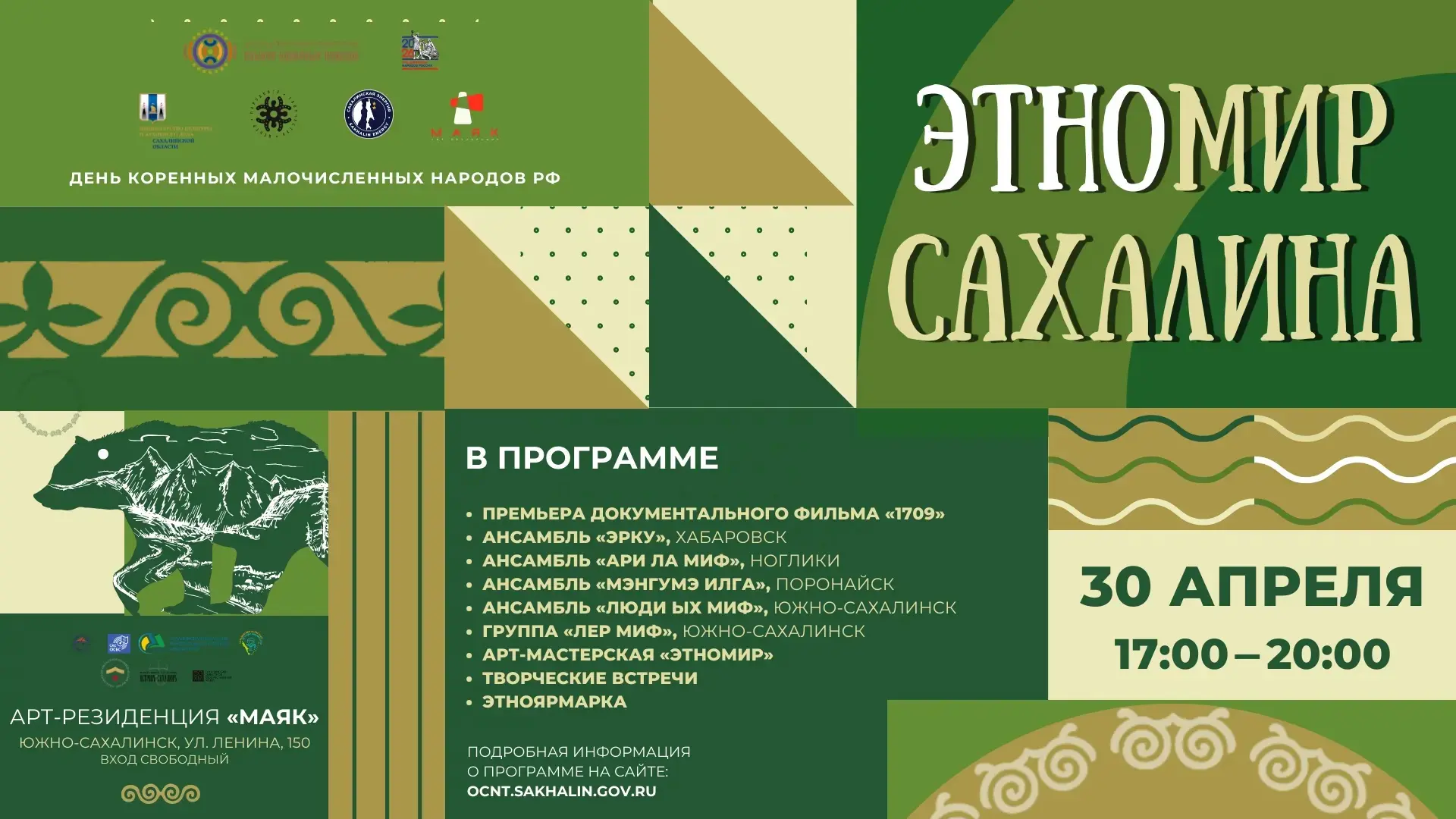 На главной сцене пройдут торжественное открытие и концертная программа. Зрителей ждут: дефиле - коллекция «Касказия» дизайнера Александры Григорьевой, интерактивная программа от этноцентра «Люди Ых миф», викторины, стихи и презентации. Поделятся своим творчеством этно-коллективы: «Мэнгумэ илга» из Поронайска, «Ари ла миф» из Ноглик, этно-фолк группа «Лер миф» из Южно-Сахалинска. Также приедут гости из Хабаровска – молодежный ансамбль «Эрку». Кульминацией вечера станет премьерный показ и обсуждение документального фильма «1709» режиссера Александра Ли.