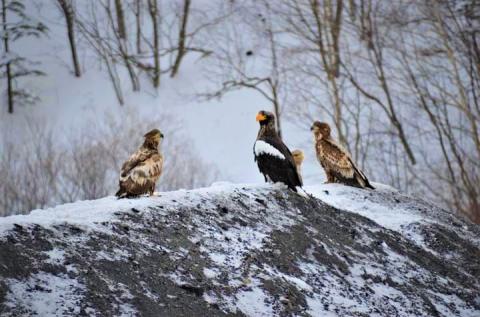 Белоплечий орлан готовится к перелёту на север острова, к исконным местам выведения своего потомства. Молодые птицы ещё без характерного оперения. От встречи с этой мощной птицей попросту забываешь о мирской суете.