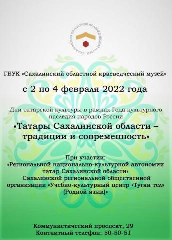 Со 2 по 4 февраля в Сахалинском областном краеведческом музее пройдут Дни татарской культуры, приуроченные к Году культурного наследия народов России, – «Татары Сахалинской области – традиции и современность».